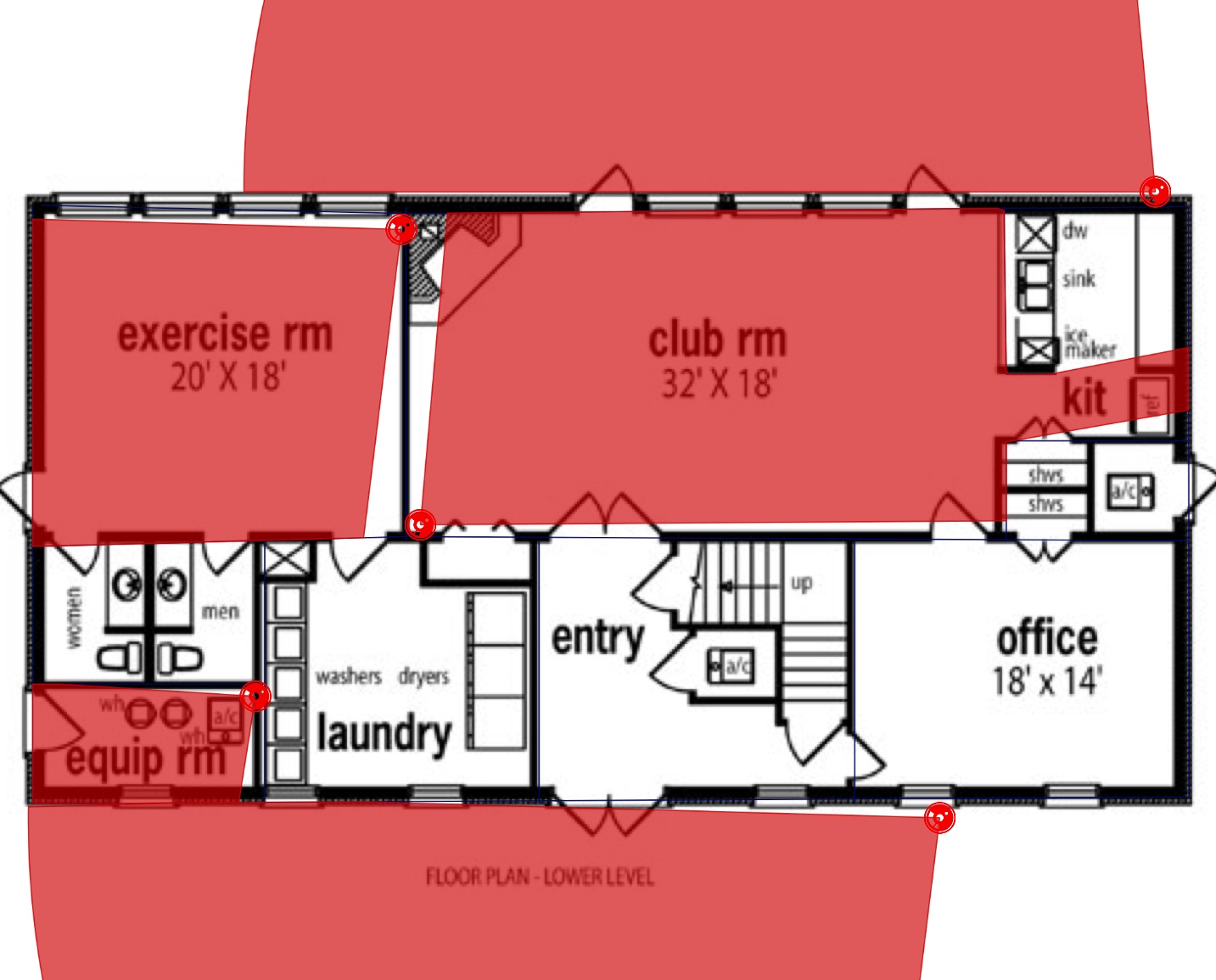 • The red zones indicate the views of strategically placed fixed lens wide angle cameras in stairwells.