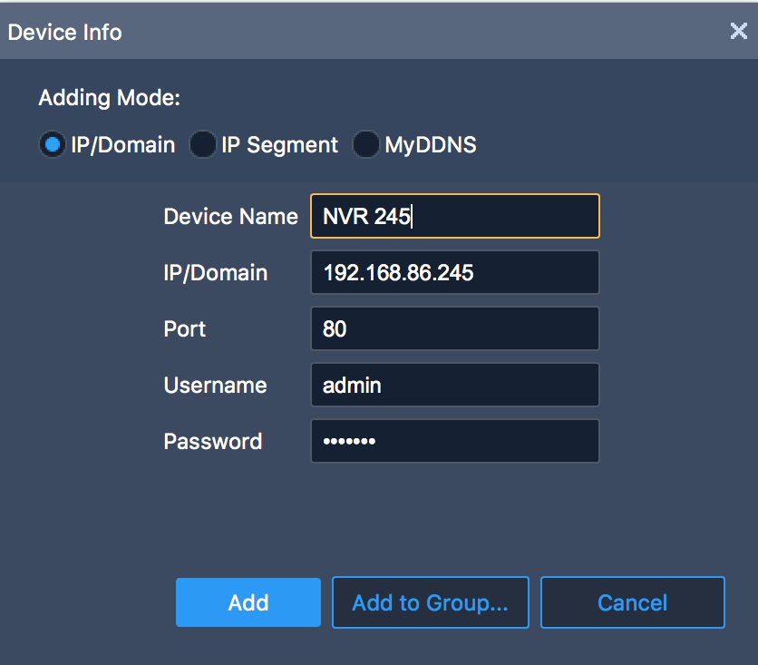 When you log in, you will see the Add Device pop-up screen. Local devices will appear on this screen and can be added to SCW Viewstation. Enter the login information for the NVR, select the NVR from the list, and click Add.