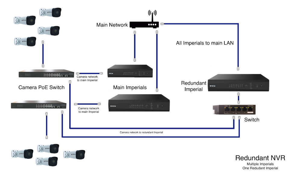 If you have a single Imperial NVR and you wanted to have a redundant Imperial you simply have to connect the redundant Imperial to your main network using LAN1 and connect the camera network/switch to LAN2.